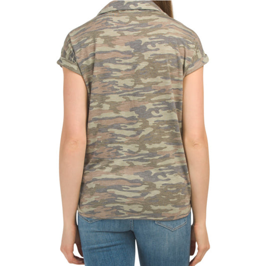 ALISON ANDREWS Camo Collared Button Down Tie Waist Top