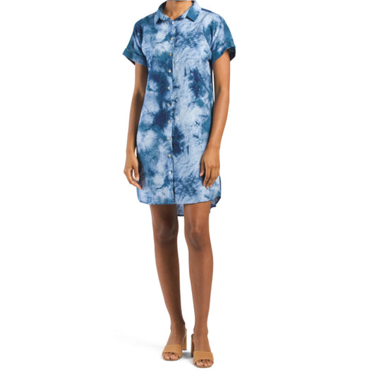 Cynthia Rowley Women's Linen Hi-low Hem Short Sleeve Tie Dye Print Mini Shirt Dress