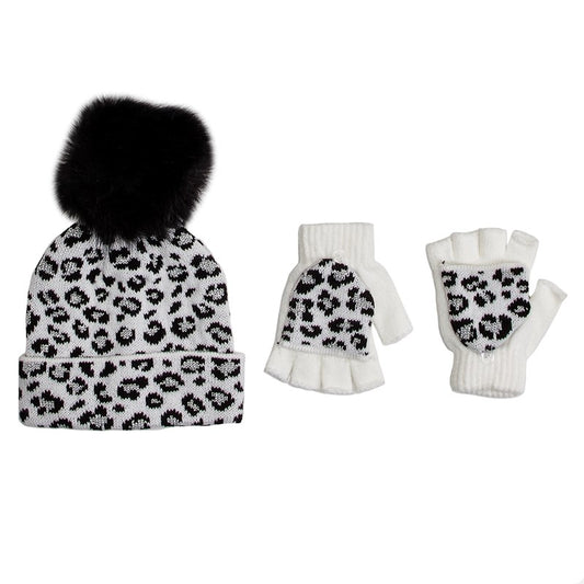 Love2Design Girls Age (4-6) Cheetah Print Knit Faux Fur Pom Hat with Flip Top Gloves Set