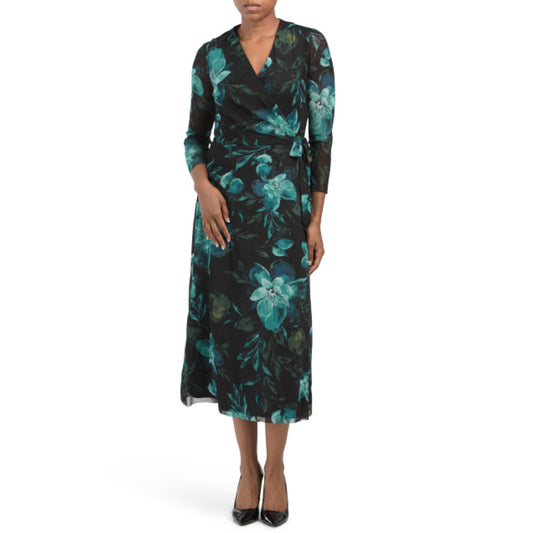 Anne Klein Women's Long Sleeve Floral Print Tie Waist Wrap Midi Dress
