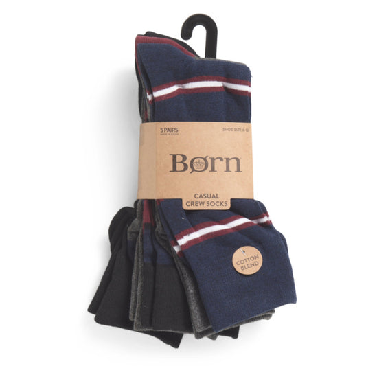 BORN Men's 5-Pk Soft Cotton Blend Stripes Casual Crew Socks
