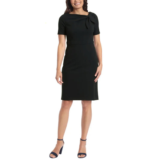 London Times Women's Short Sleeve Gathered Neck Tie Sheath Mini Dress