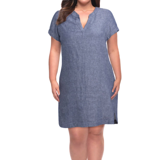 TAHARI Women's Plus Linen Short Sleeve Split Neck Mini Dress