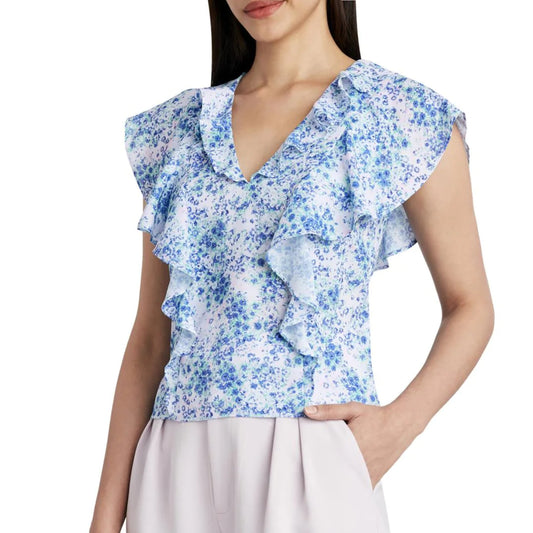 BCBGeneration Women's Floral Print Flutter Sleeve Ruffle Blouse Top