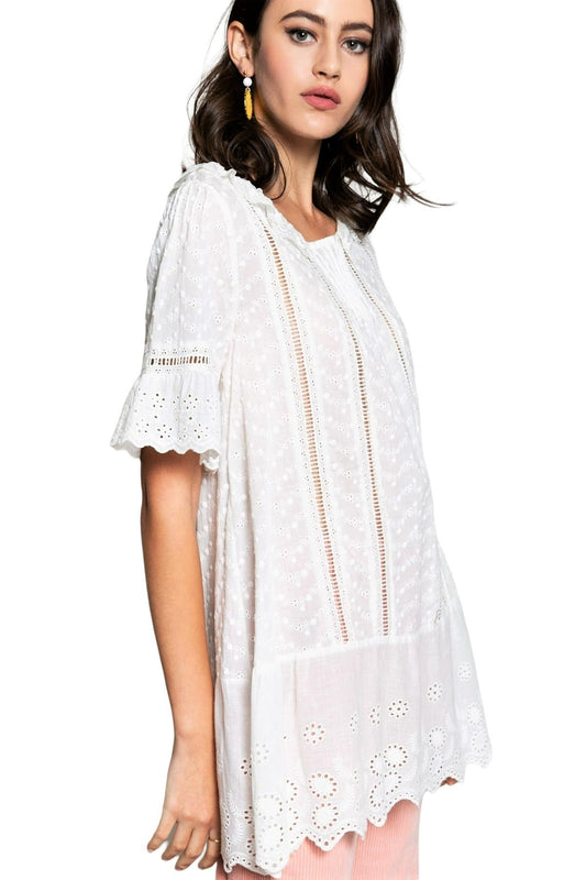 POL Women's Boho Eyelet Embroidered Lace Ruffle Trim Blouse Tunic Top