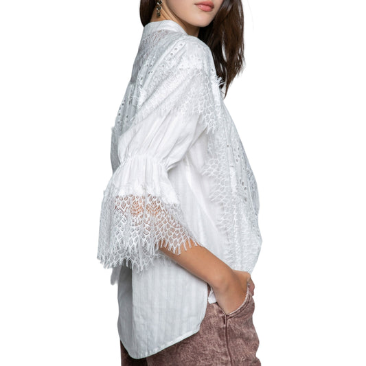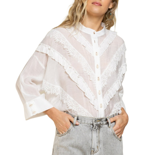 POL Women's Joy Ruffle Lace Trim Seashell Button Down Shirt