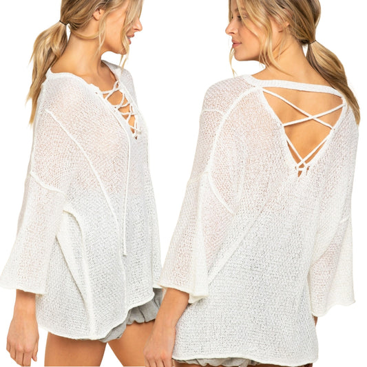 POL Women's Lace-up V-Neck Raw Edge Lightweight Knit Tunic Top Sweater