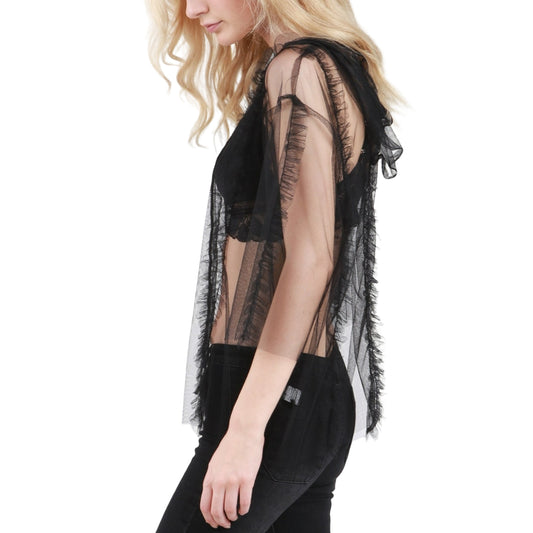 POL Shear Mesh Ruffle Hooded Top Blouse