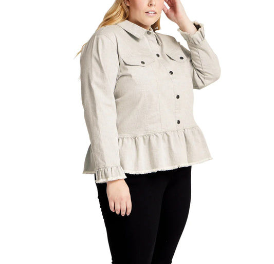 Given Kale Women's Plus Ruffle Trim Stretch Cotton Blend Twill Peplum Shirt Jacket
