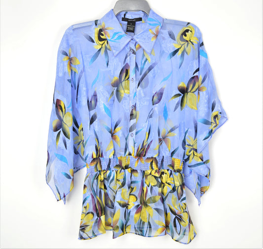 Vertigo Women's Floral Print Smocked Waist Kimono Sleeve Button Front Chiffon Blouse