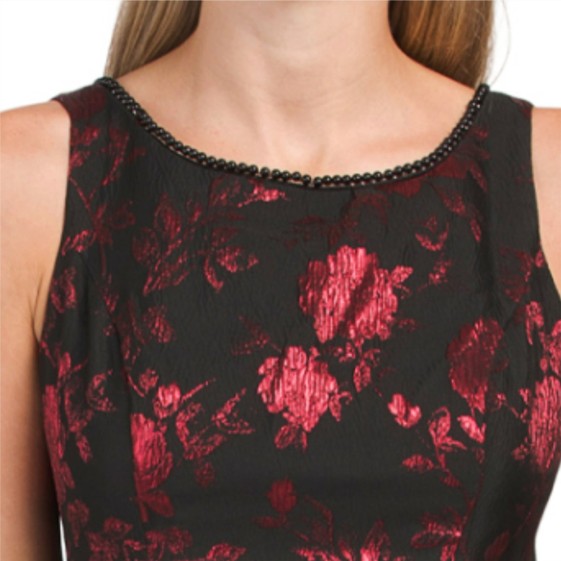 This Adrianna Papell dress features a stunning metallic floral print and faux pearl trim, giving it a unique and luxurious look. The fit-and-flare style flatters your figure while the mini length adds a touch of playfulness. Perfect for special occasions or a night out.