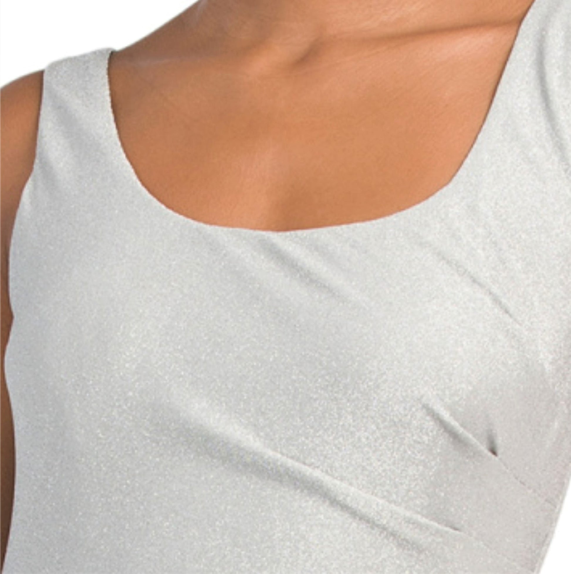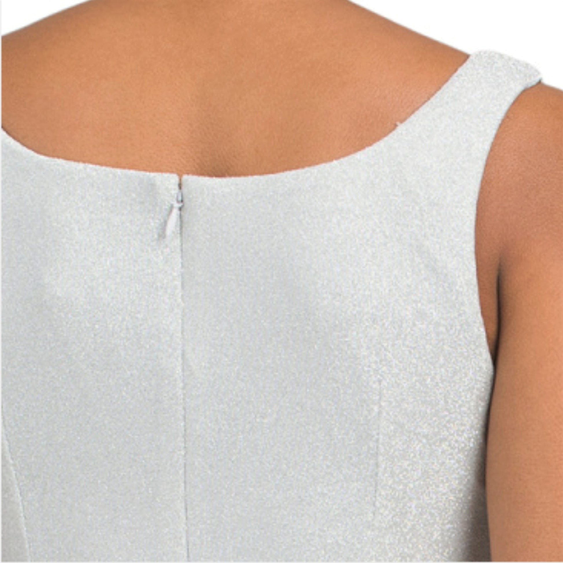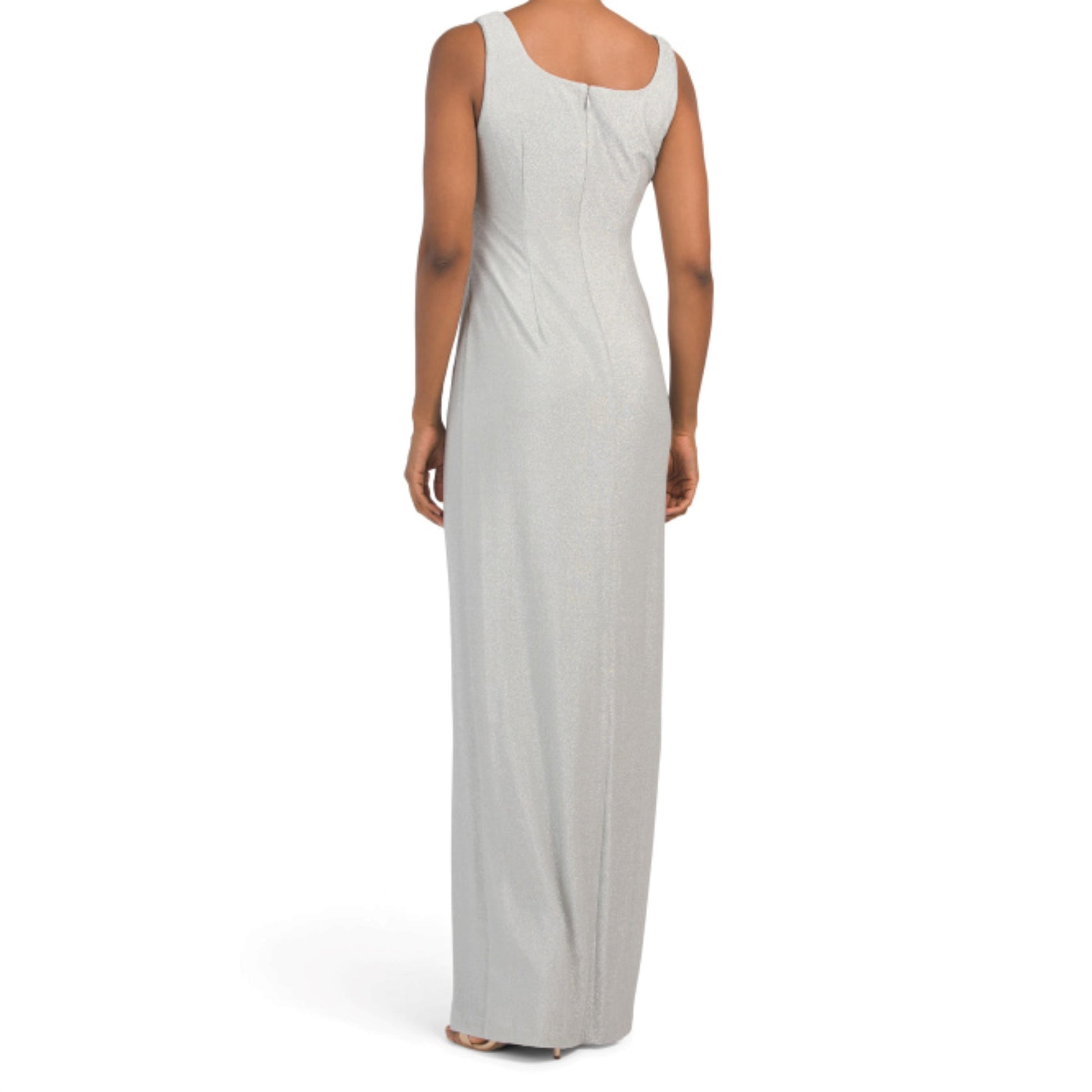 Look stunning for any special event in this ADRIANNA PAPELL gown featuring a shimmering metallic finish, side pleats, and a daring front slit. The sleeveless design, comfortable fit, and flattering silhouette make this the perfect dress for any occasion.