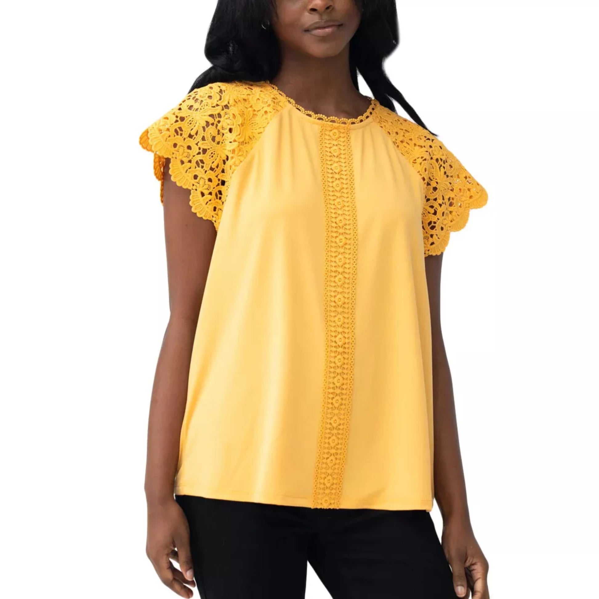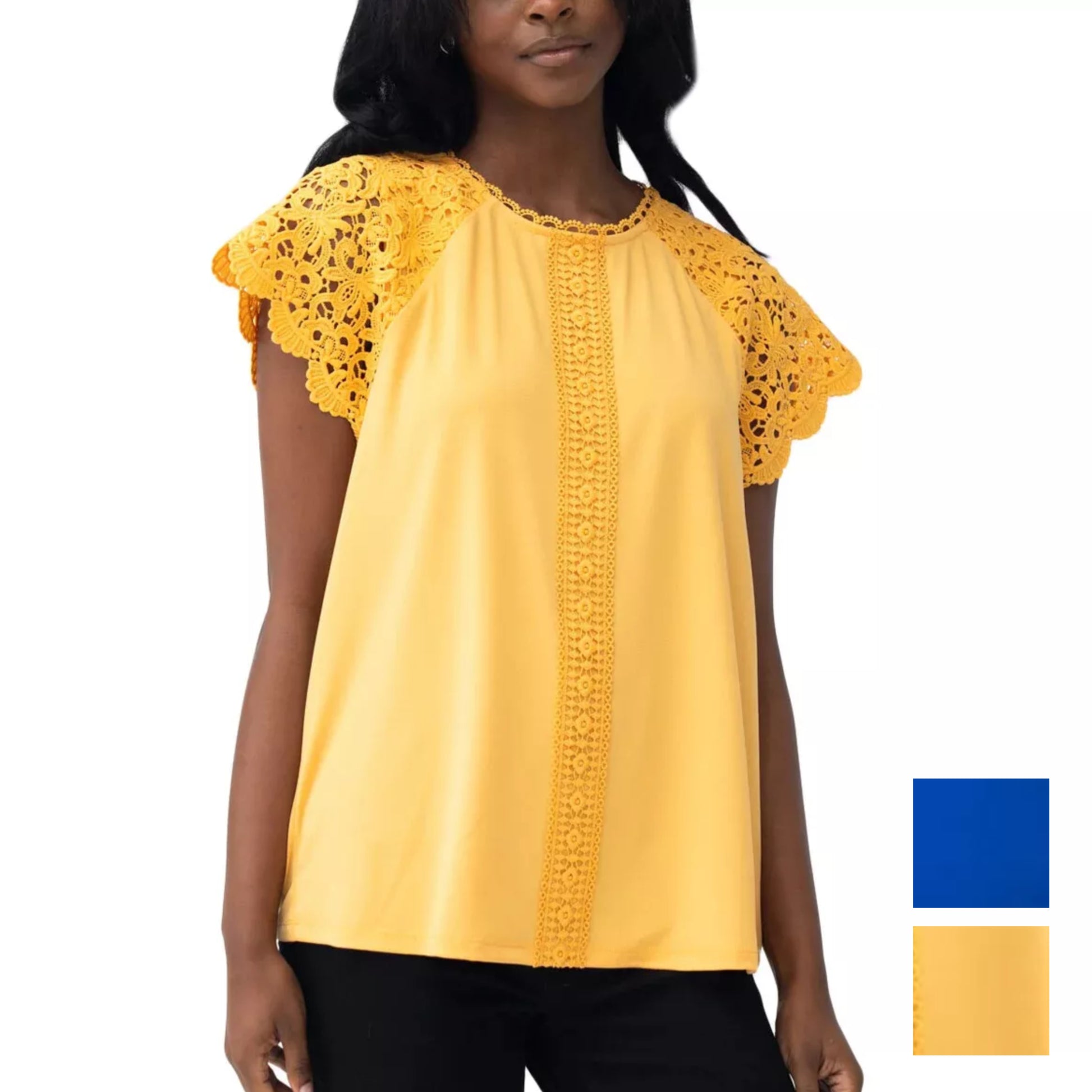 Cable & Gauge Women's Lace Trim Flutter Sleeves Top Blouse