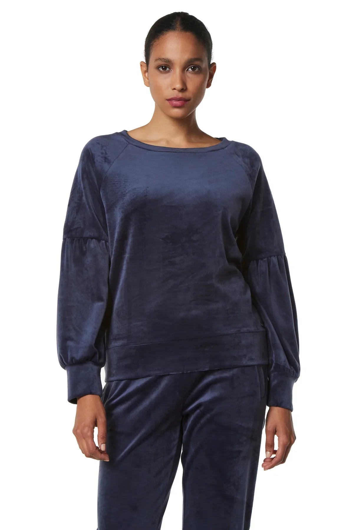 The soft look of velvet and the modern trend of the puff sleeve meet in perfect harmony in this crew neck top. Oversized puff long sleeves, semi-relaxed fit and a straight banded hemline.