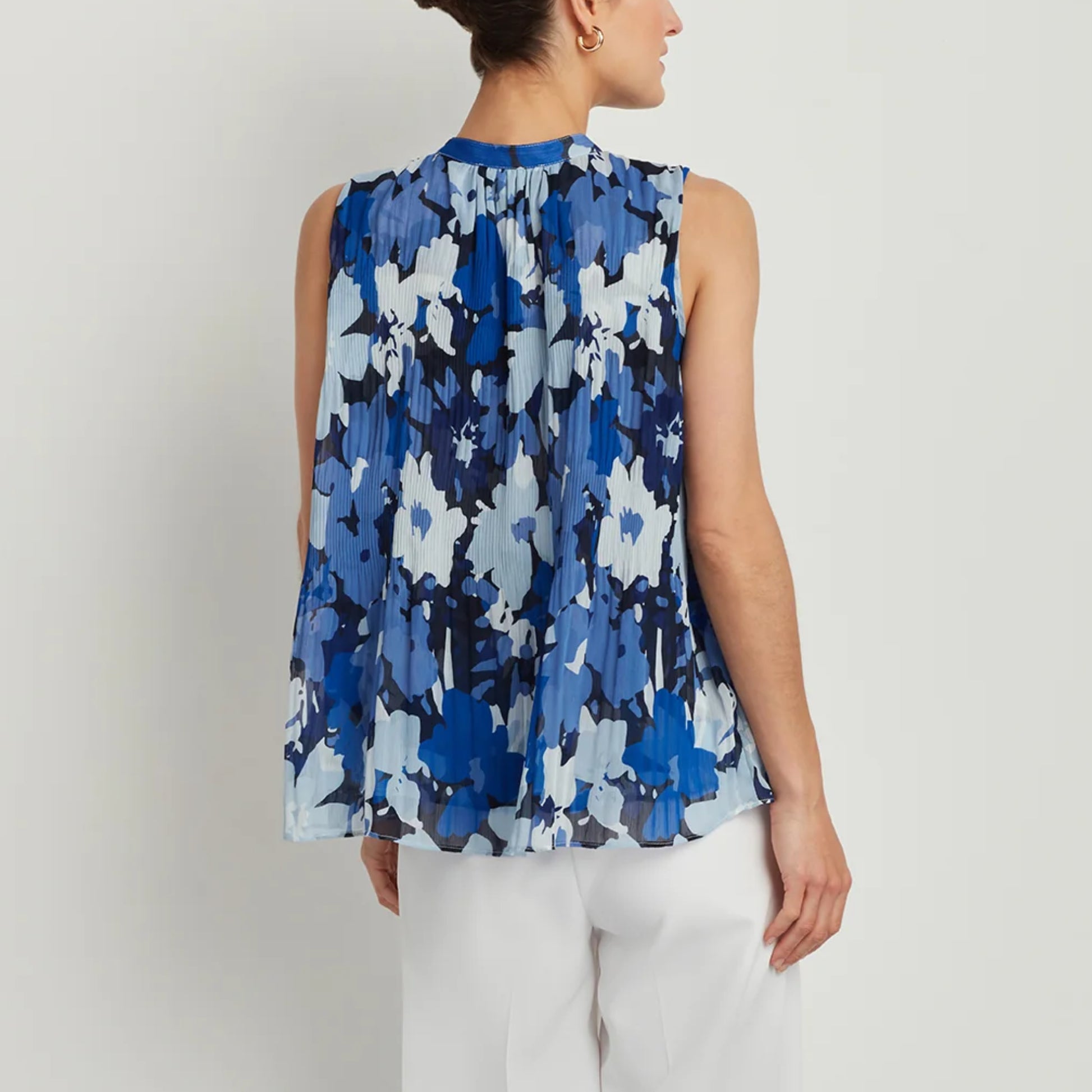 ELLEN TRACY Women's Floral Print Tie Neck Pleated Sleeveless Blouse