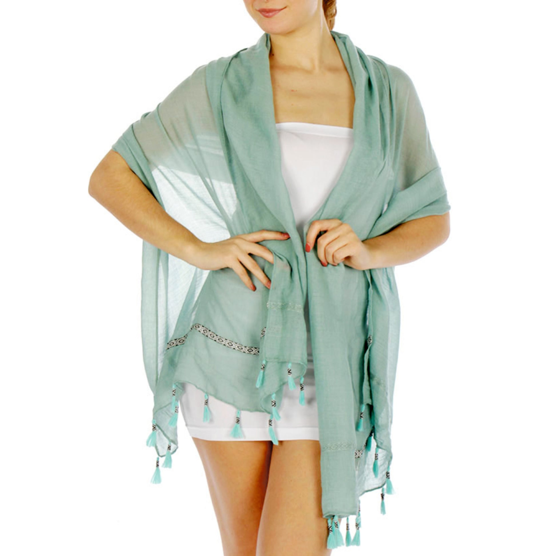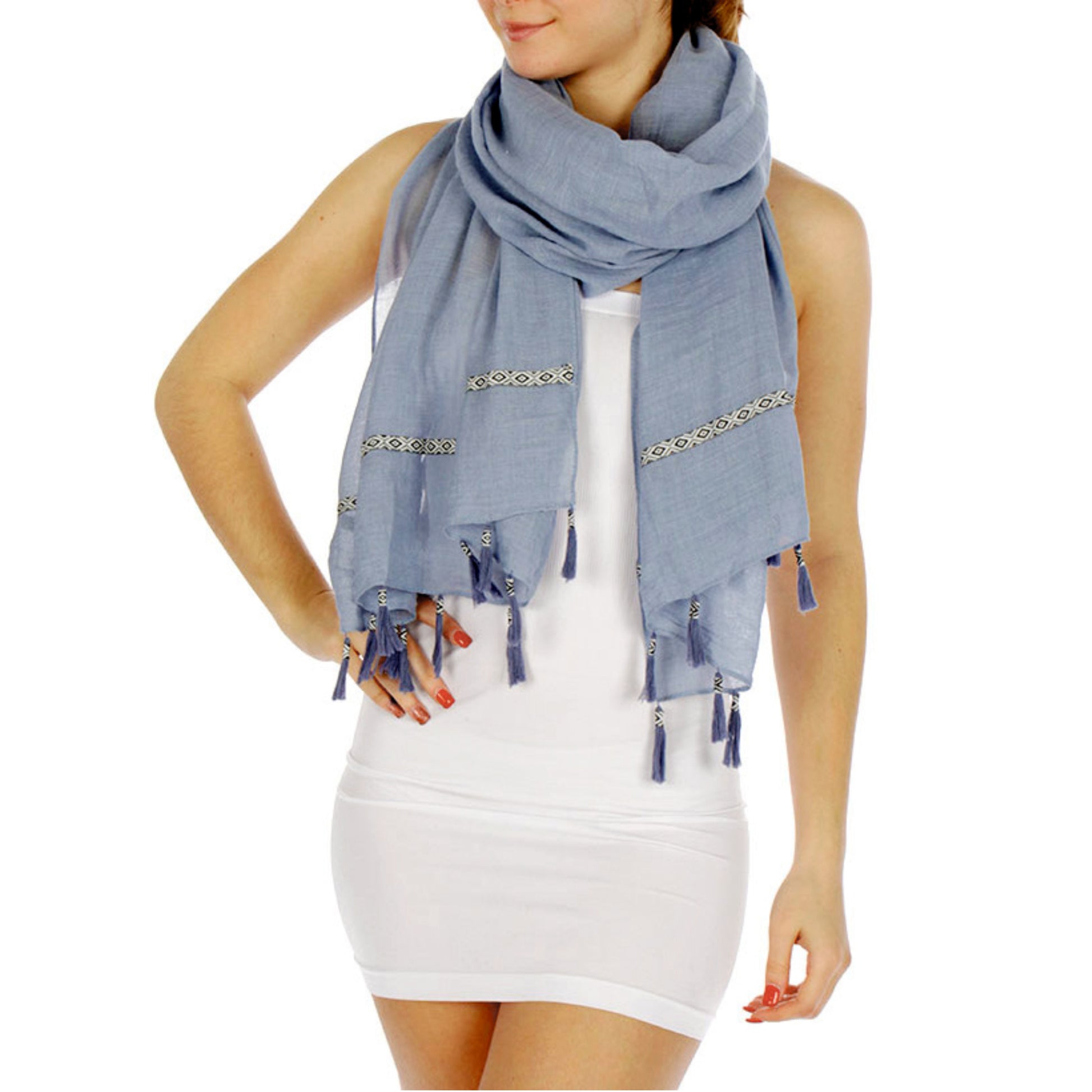 Feria Mode Women's Lightweight Aztec Insert Trim Tasseled Scarf Shawl Wrap Cover-Up
