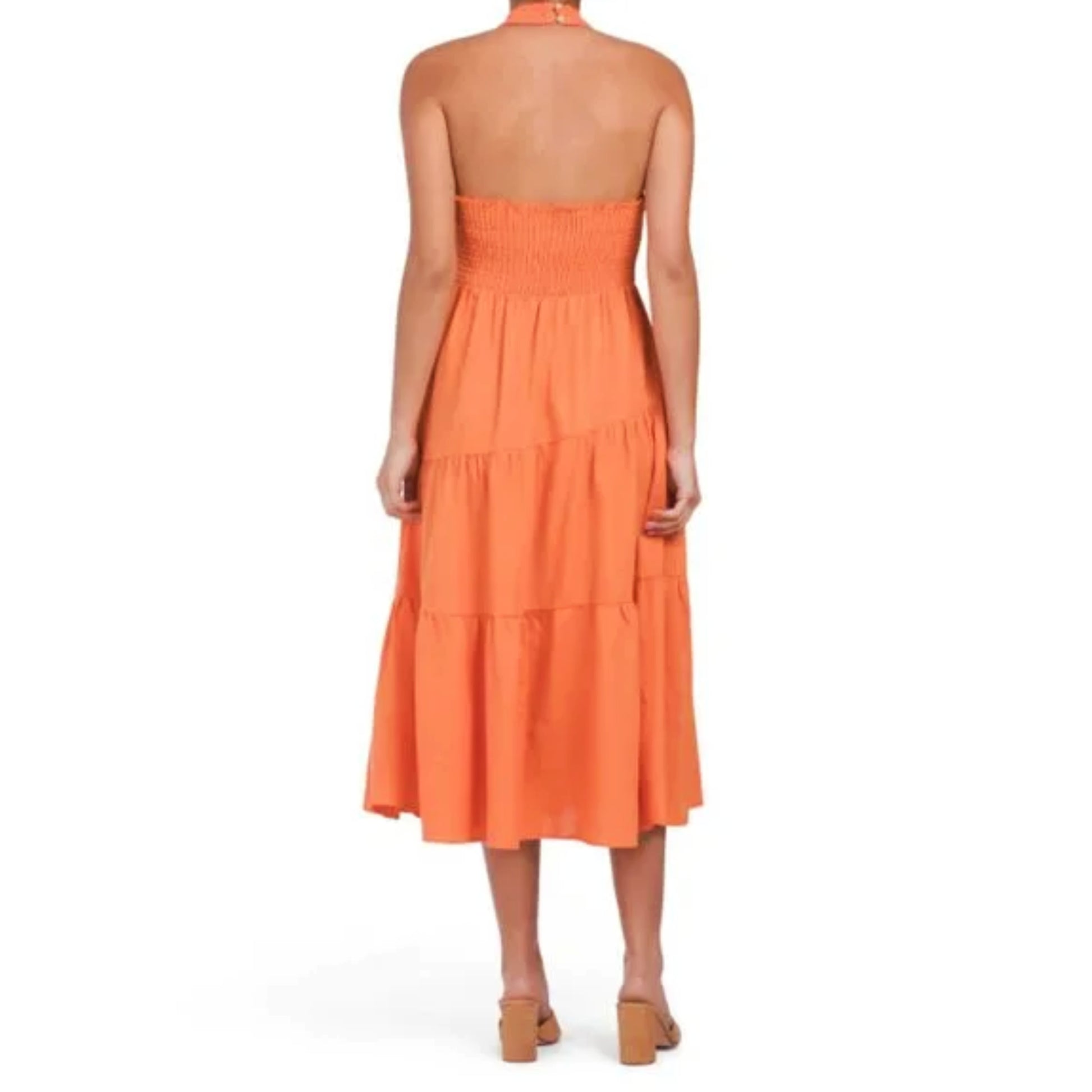 Crafted for style and comfort, this FORCYNTHIA Halter Neck Tiered Midi Dress is perfect for any occasion. The halter neck design and tiered skirt create a flattering silhouette, while the linen blend fabric offers a lightweight and breathable fit. Elevate your wardrobe with this versatile and chic dress.