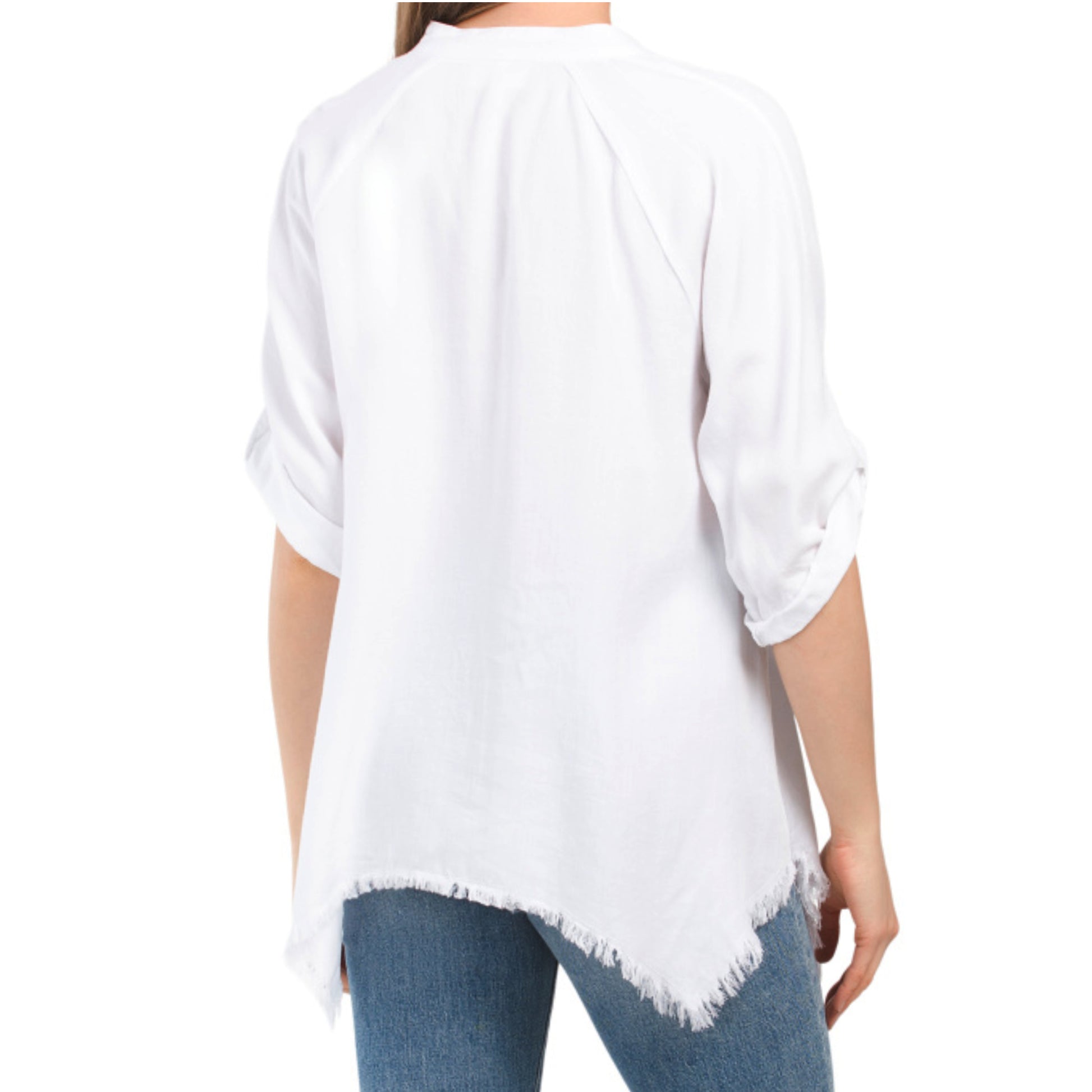 This GRAND AND GREEN long sleeve shirt is a perfect choice for casual looks. It's made from lightweight fabric with a frayed hem, button-down style, and roll tab sleeves for comfort and modern appeal. The white color is sure to make a statement wherever you go.
