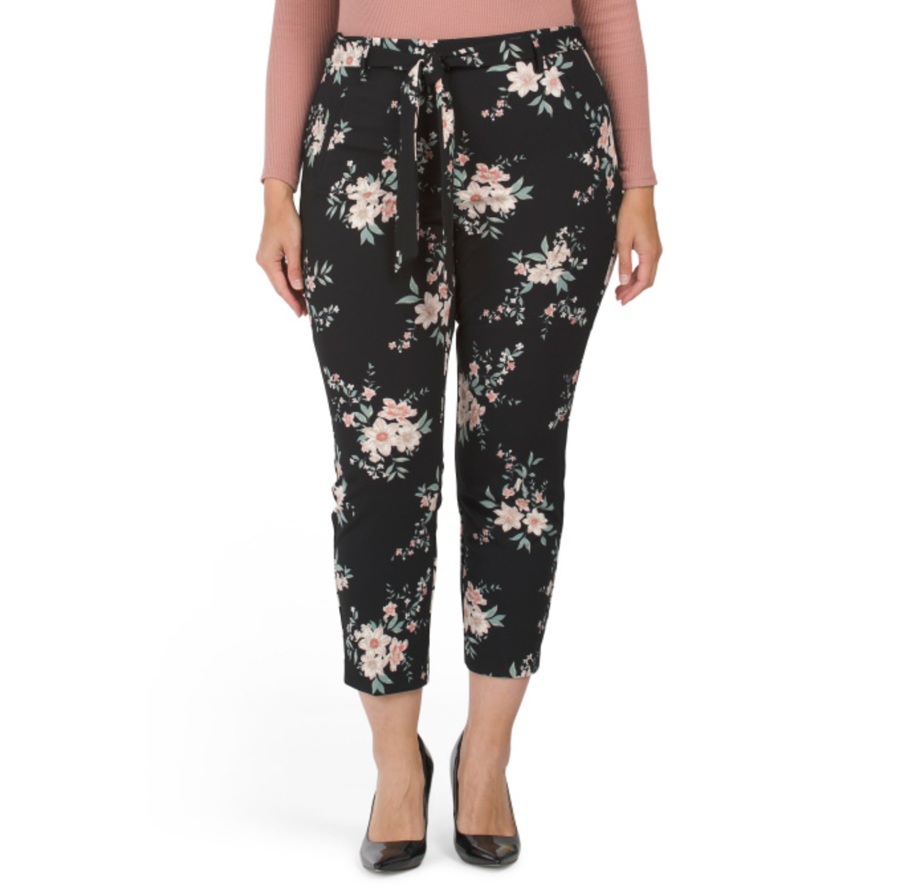 J&L WHITE Women's Plus High Rise Floral Print Techno Crepe Tie Belt Pull On Pants