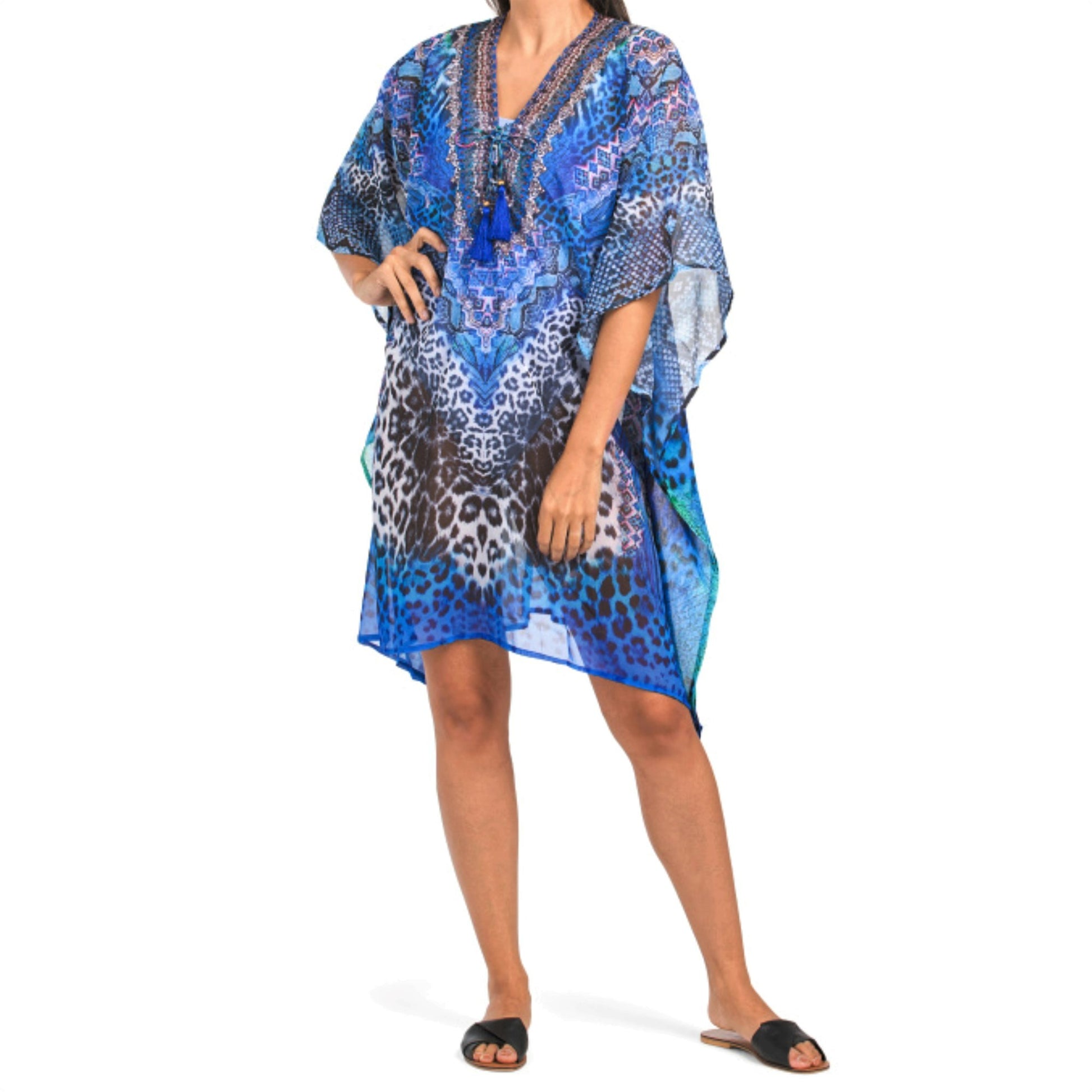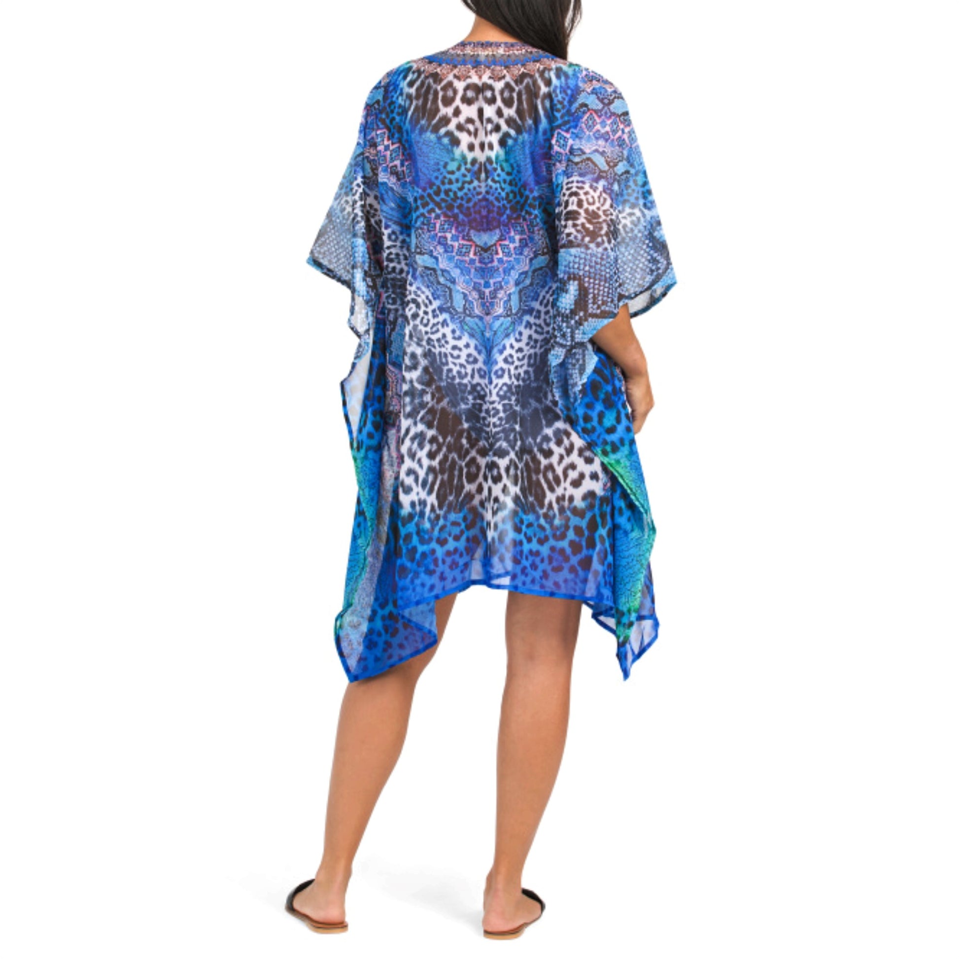 Achieve the styling with LA MODA Cat Caftan Cover-up. Features an eye-catching blend of patterns. embellished with sparkling rhinestones to bring a touch of glamour to your look. The lightweight breezy fabric offers comfortable coverage and keeps you cool in the summer heat.