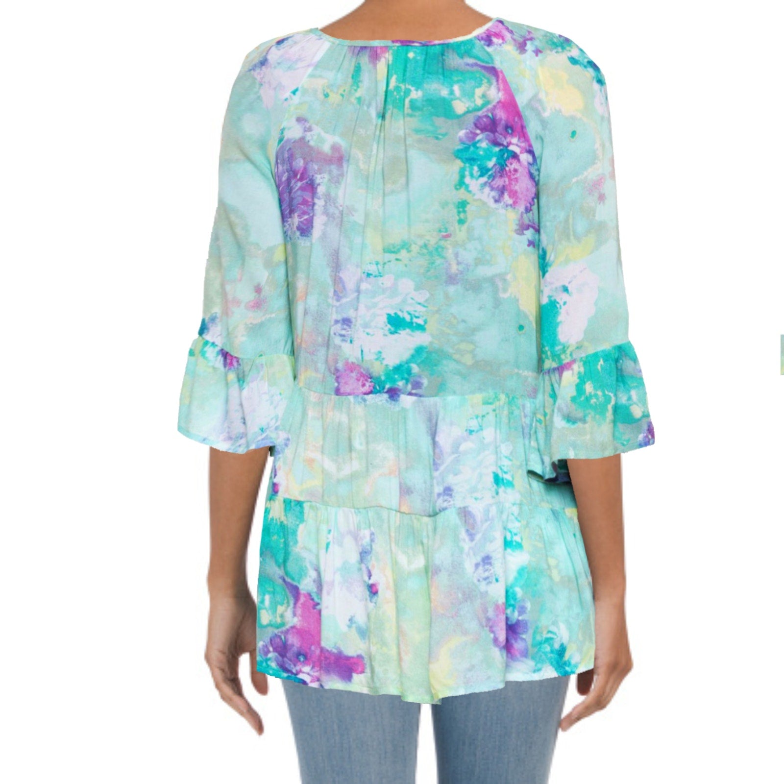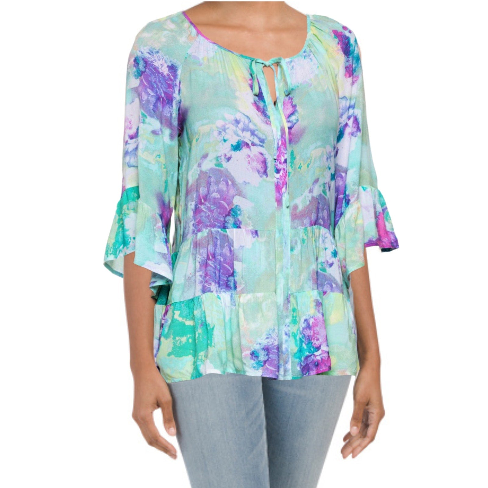 Cupio Blush Peasant Ruffle Sleeves Tired Hem Watercolor Print Blouse Tunic