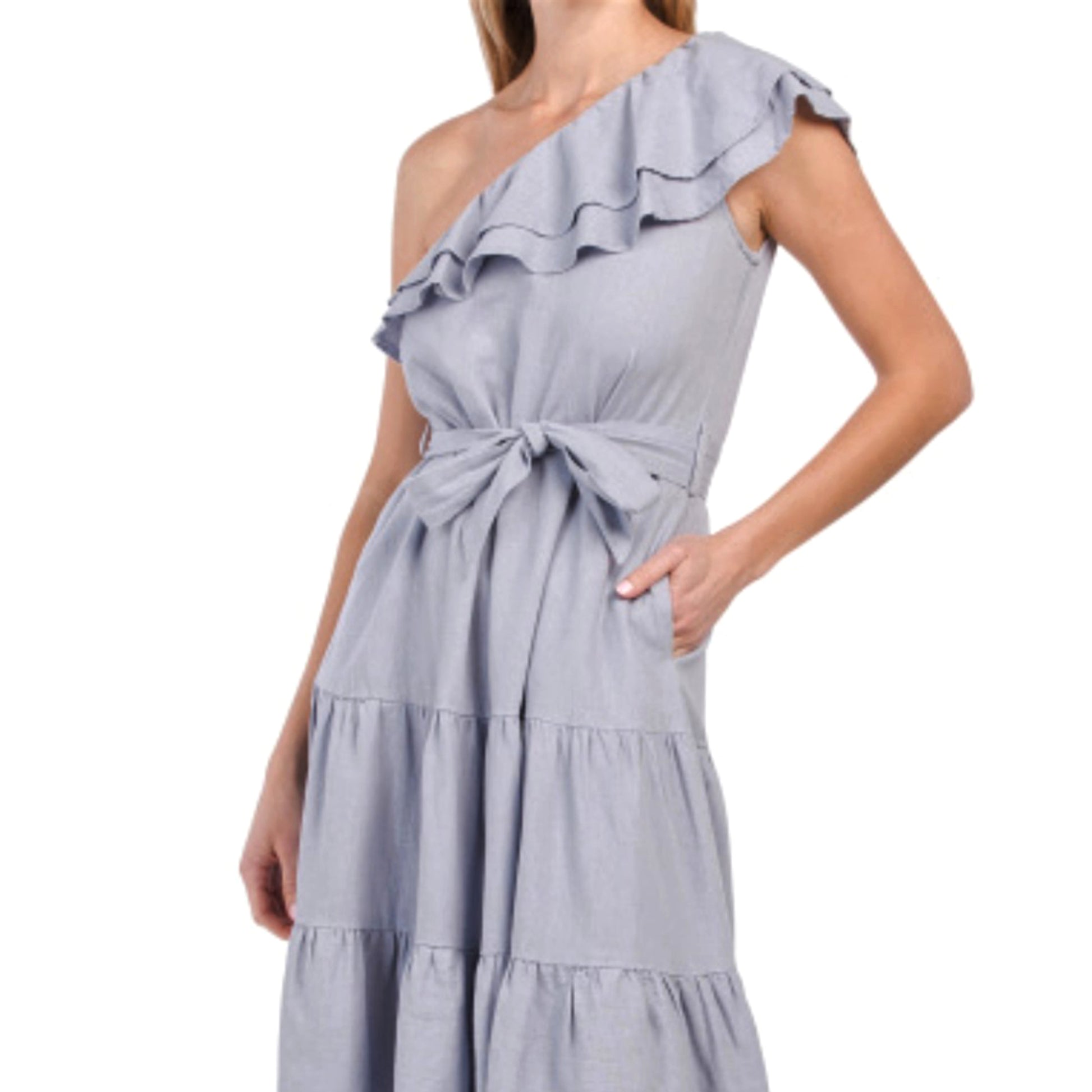 Nicole Miller Women's Asymmetrical One Shoulder Ruffle Trim Linen Tiered Midi Dress