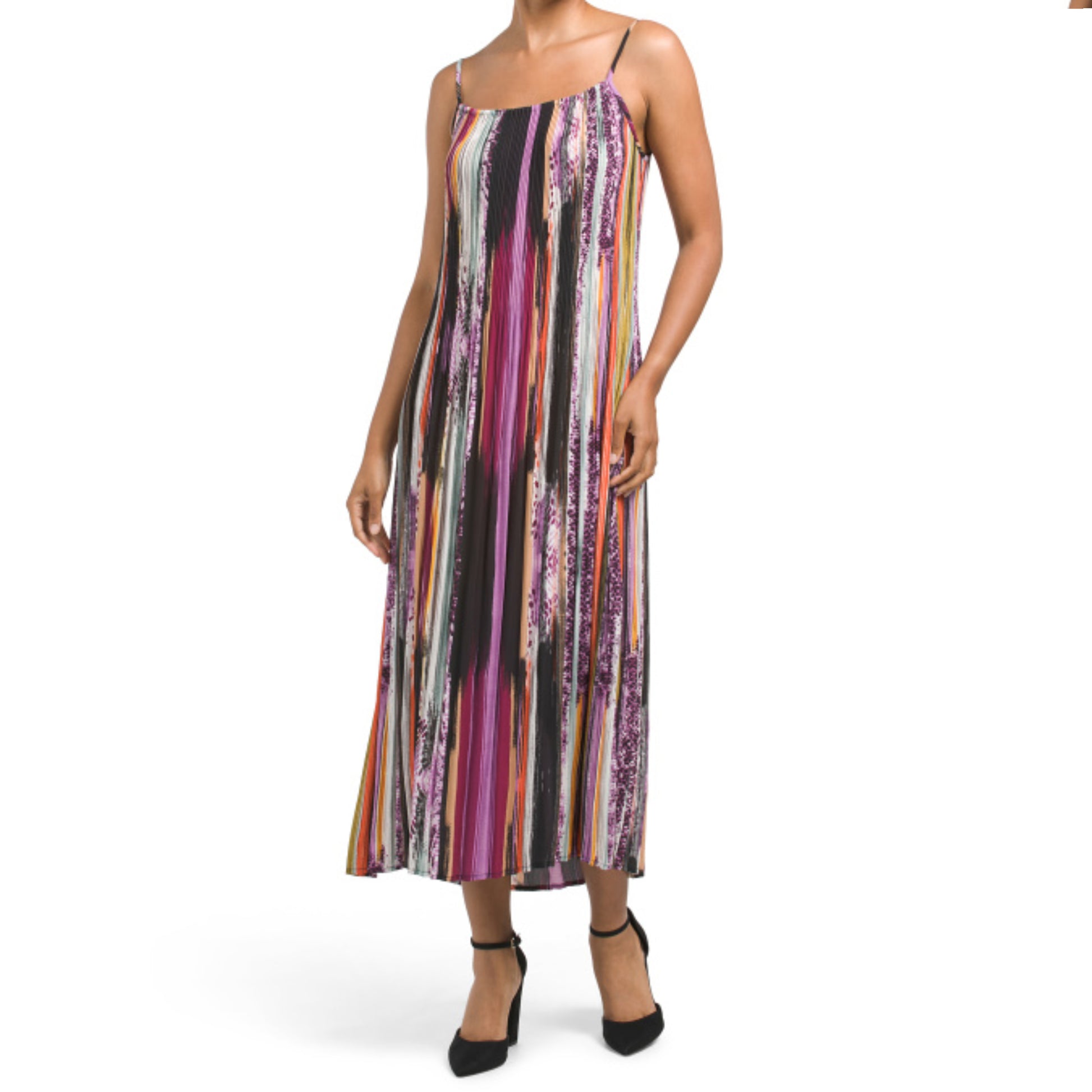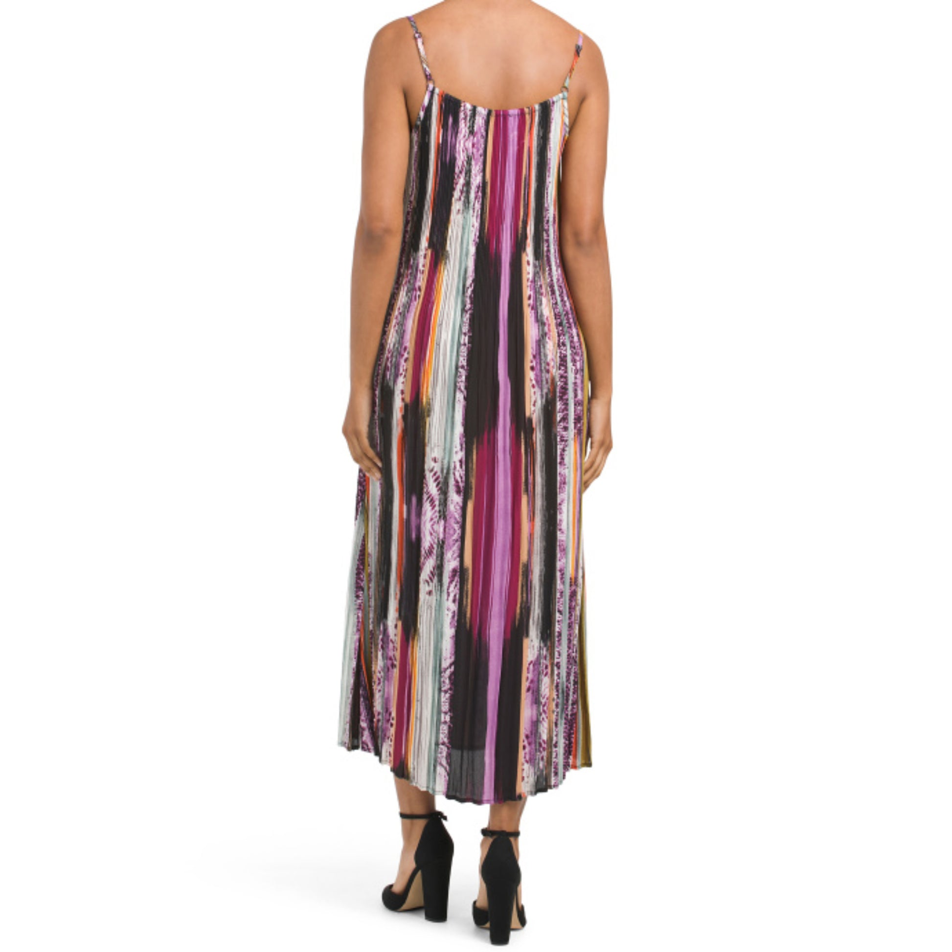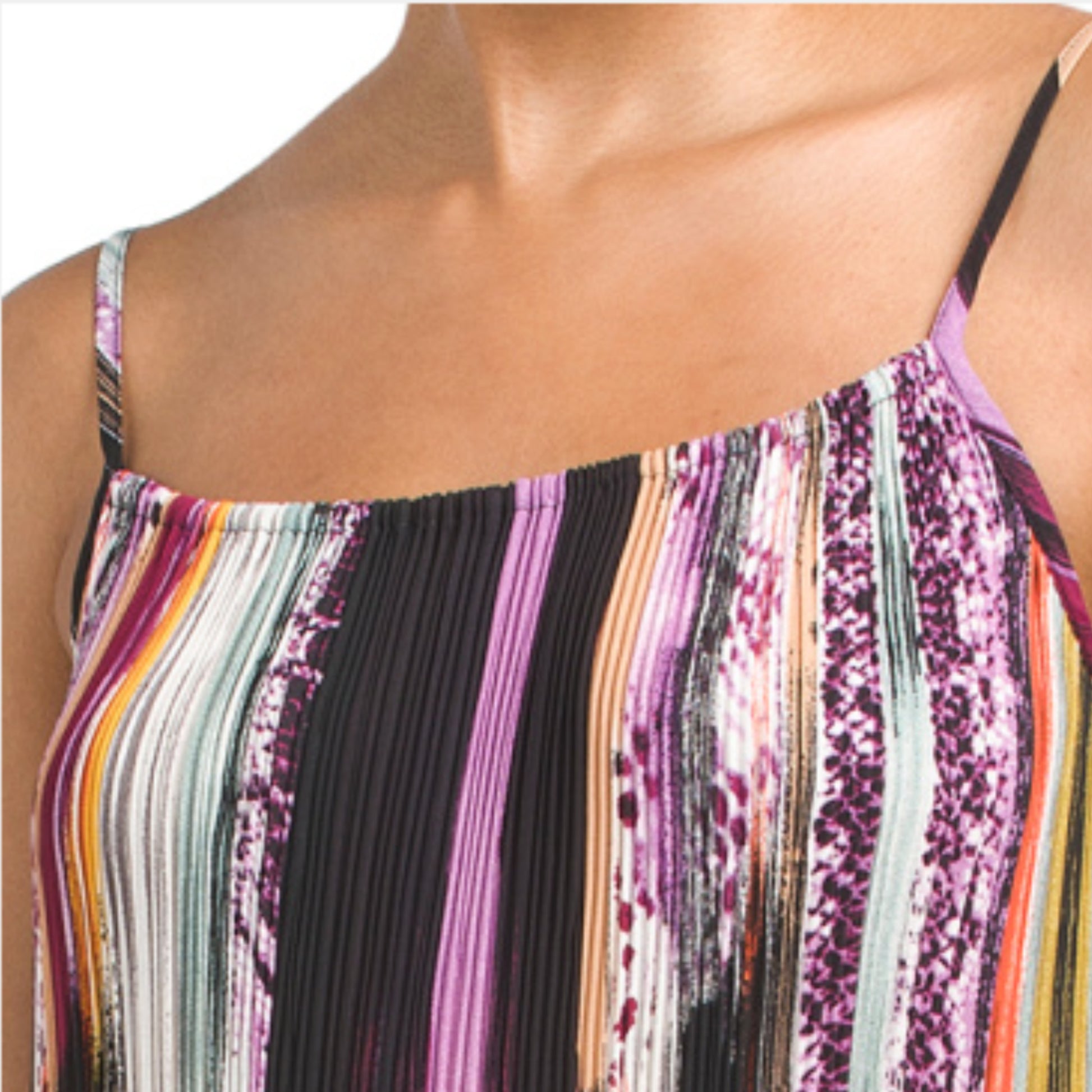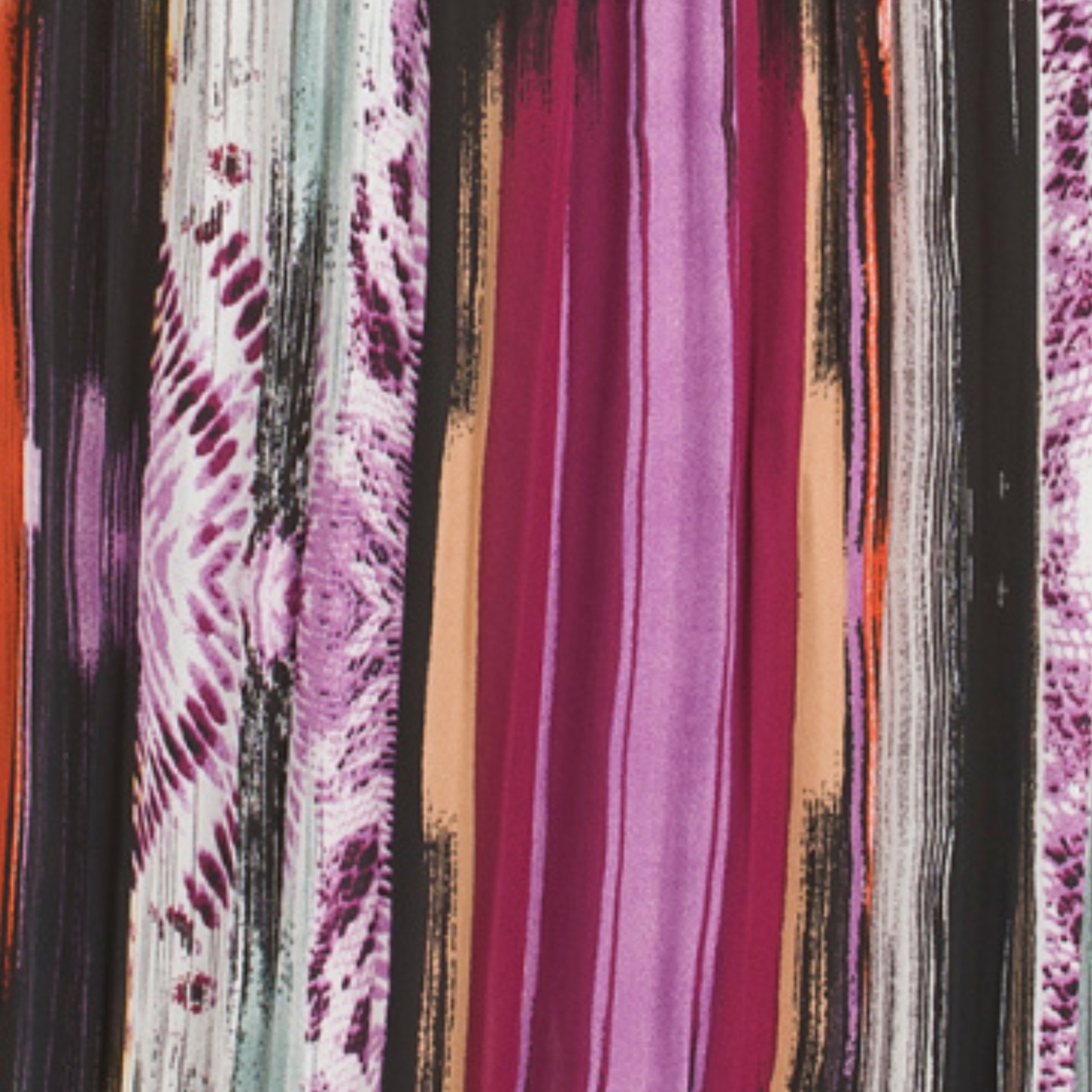 This Nicole Miller maxi dress adds a pop of playfulness to your summer wardrobe with multi-colored abstract stripes. Lightweight and flowy, it's perfect for any occasion, from a day at the beach to a night out. Embrace your quirky side with this statement piece.
