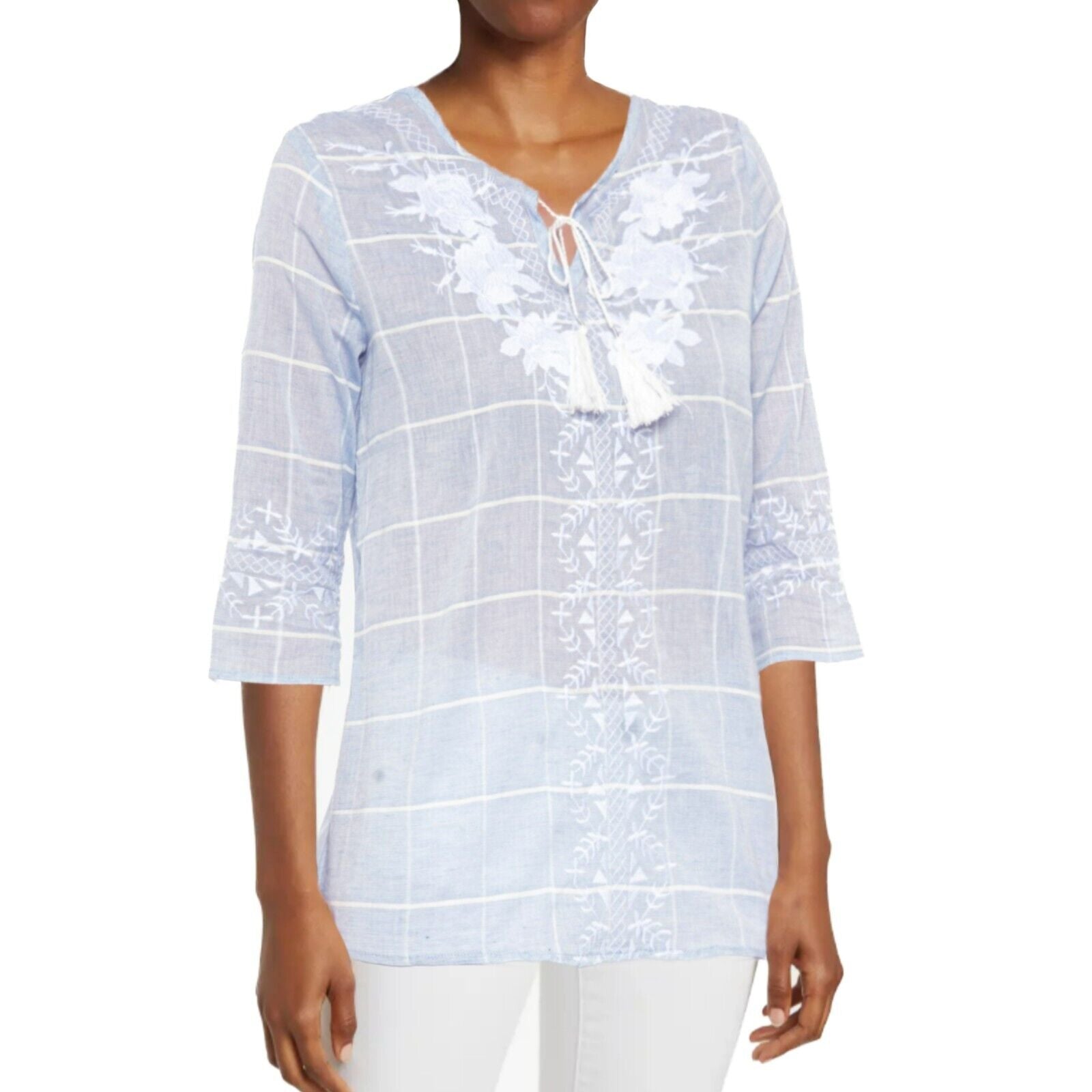 PAPARAZZI Women's Embroidered Tassels Tie Cotton Blouse Tunic