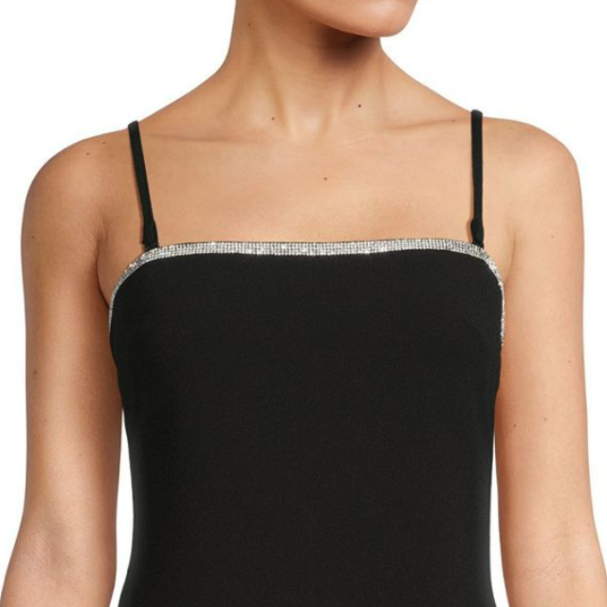 RACHEL RACHEL ROY Veronica dress features a stunning rhinestone embellished trim that adds a touch of glamour to this mini sheath dress. Made with high-quality materials, this dress is perfect for any special occasion. Make a statement and turn heads in this elegant and versatile piece.