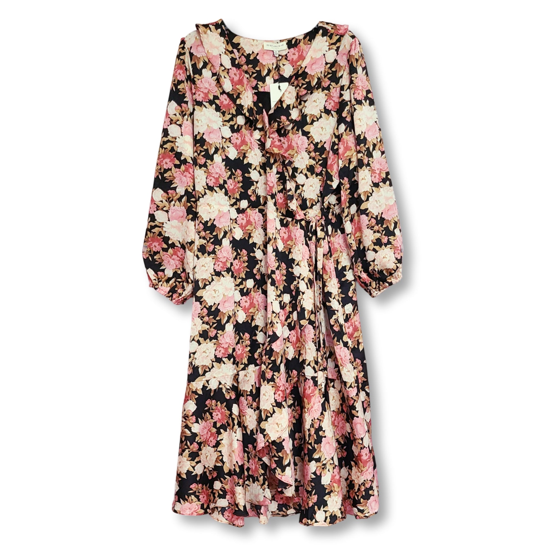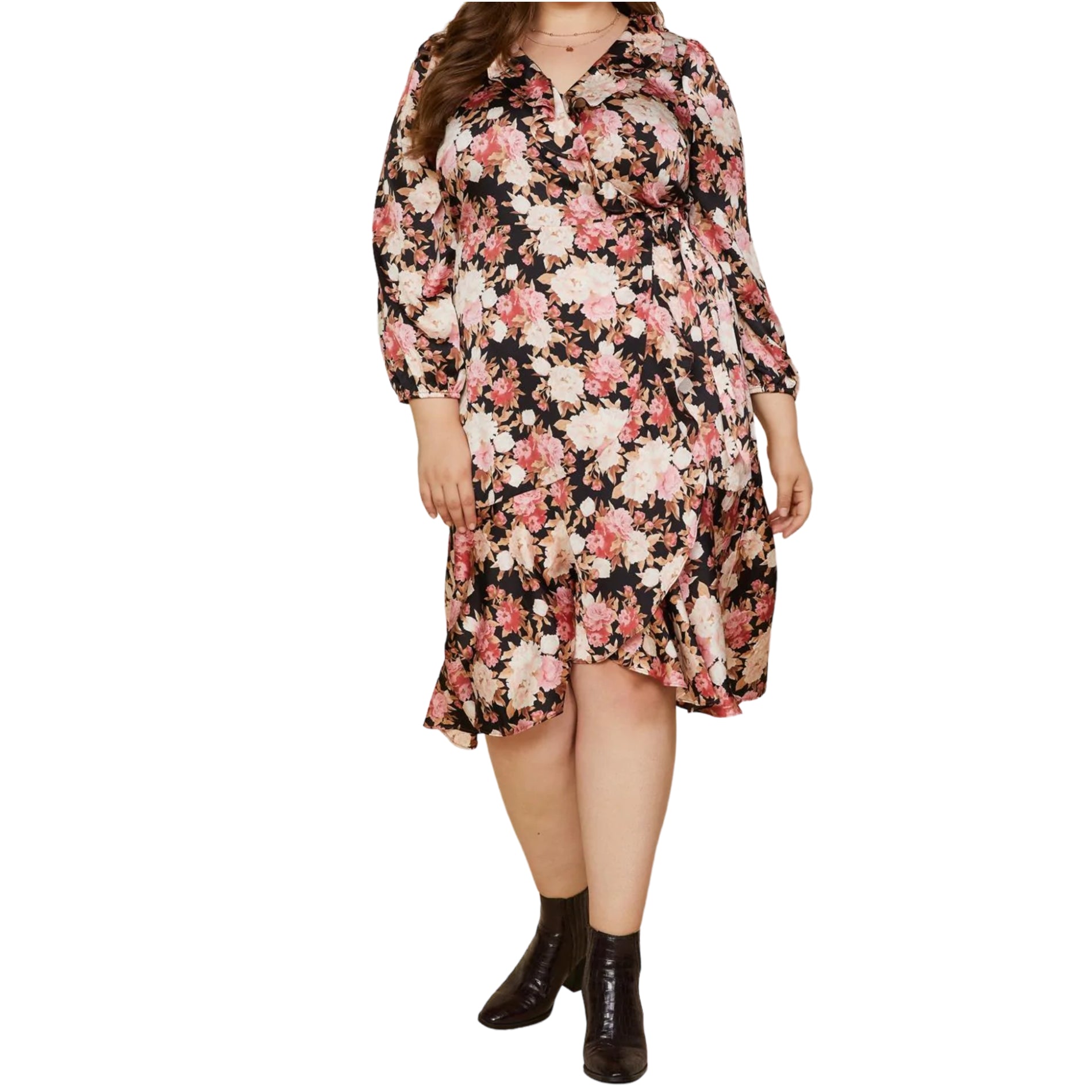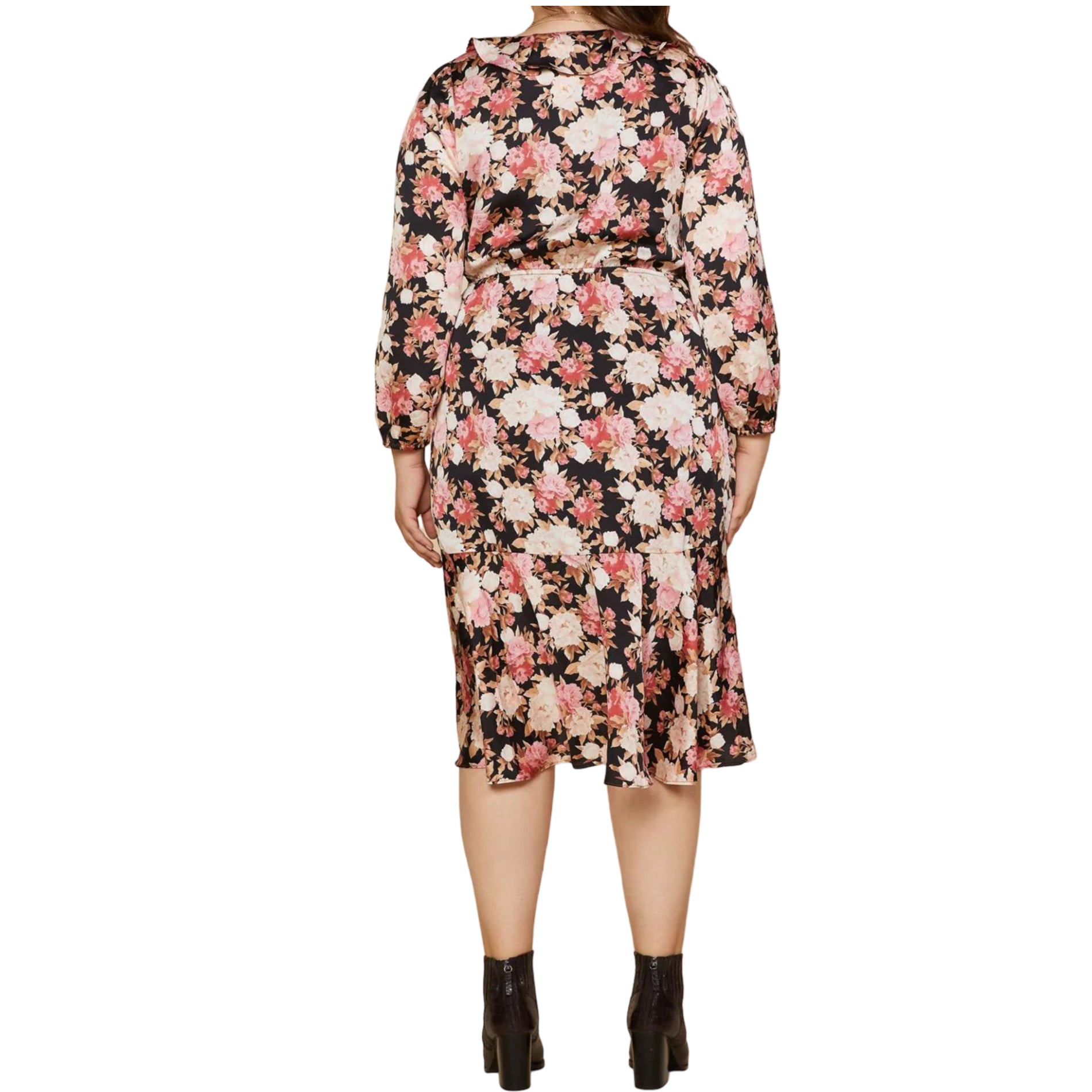 Skies are Blue Plus Rose Print Ruffle Trim Floral Wrap Midi Dress