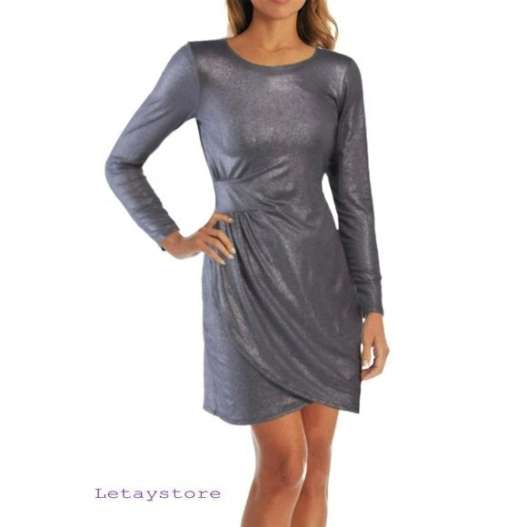 You'll love the way you look and feel in this eye-catching special occasion dress. Party anywhere in this Asymmetrical and chic long sleeve mini dress, is made of a smooth metallic shimmer stretch fabric with a ruched side and faux wrap skirt.
