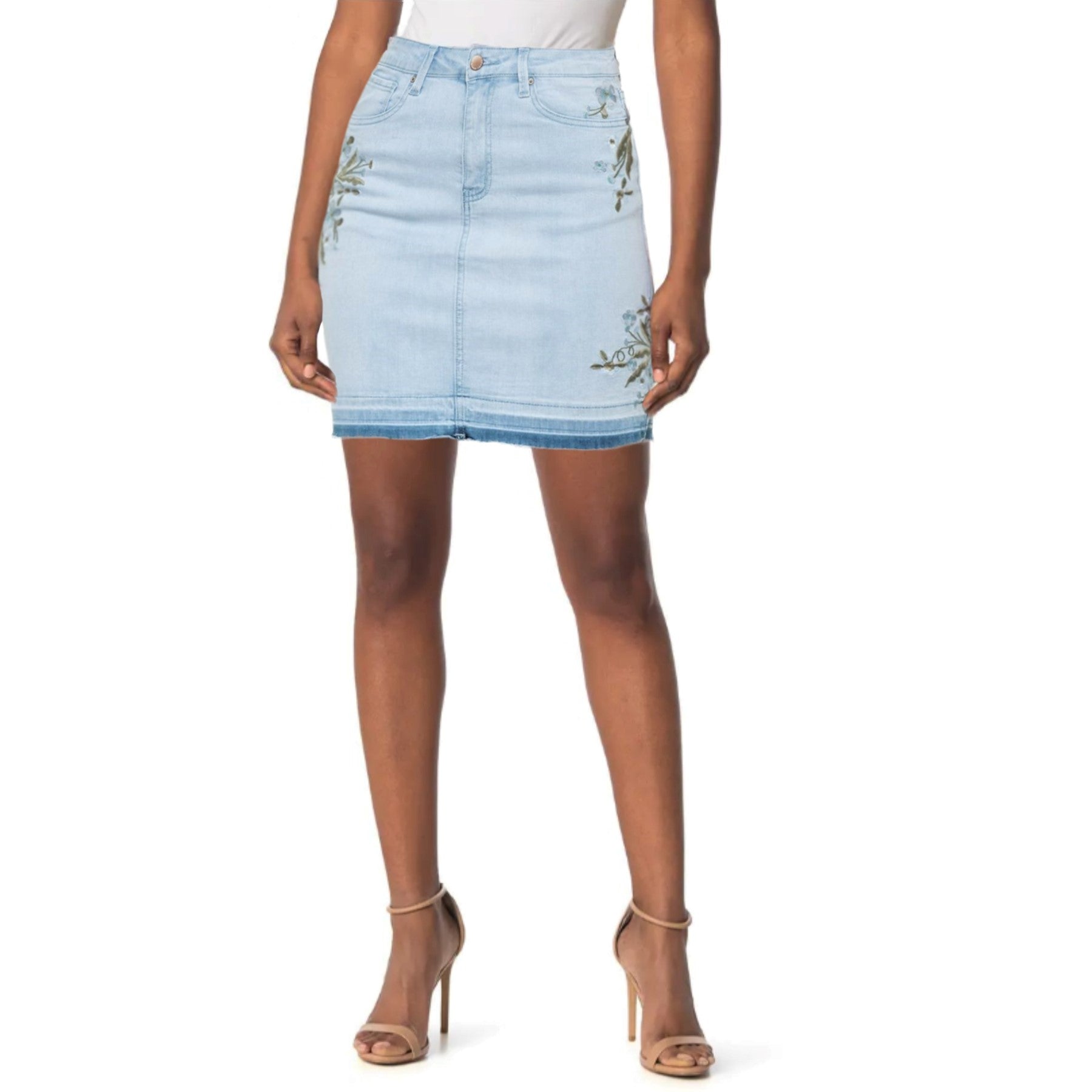 Pretty floral embroidery and a raw-edge hem add boho-inspired vibes to Velvet Heart's April pencil mini skirt, made from stretch denim for a figure-flattering fit.