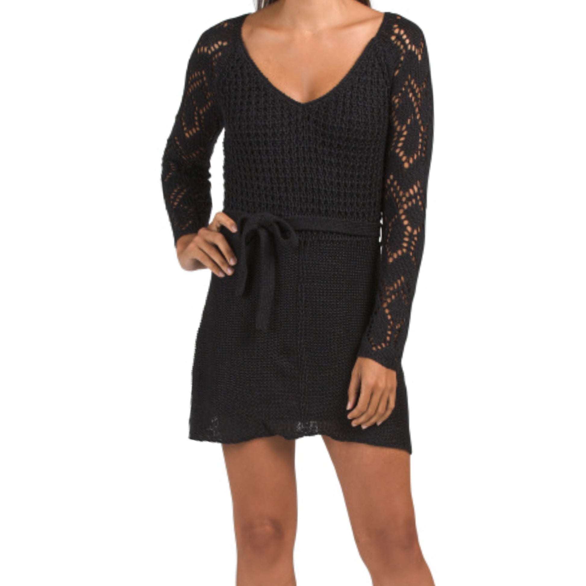Vertigo Paris Women's Crochet Knit V-Neck Belted Mini Dress