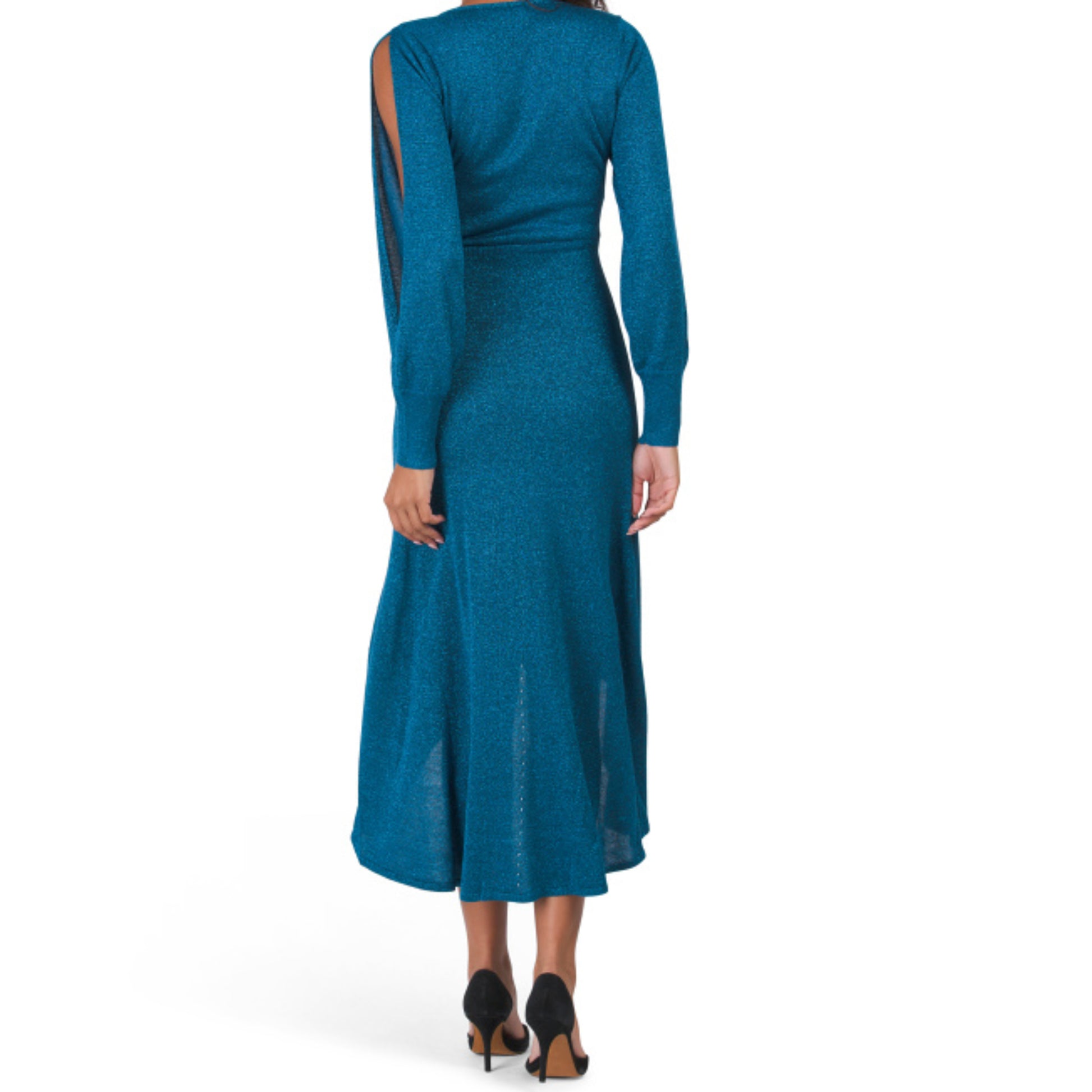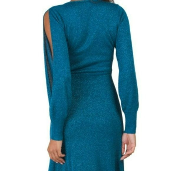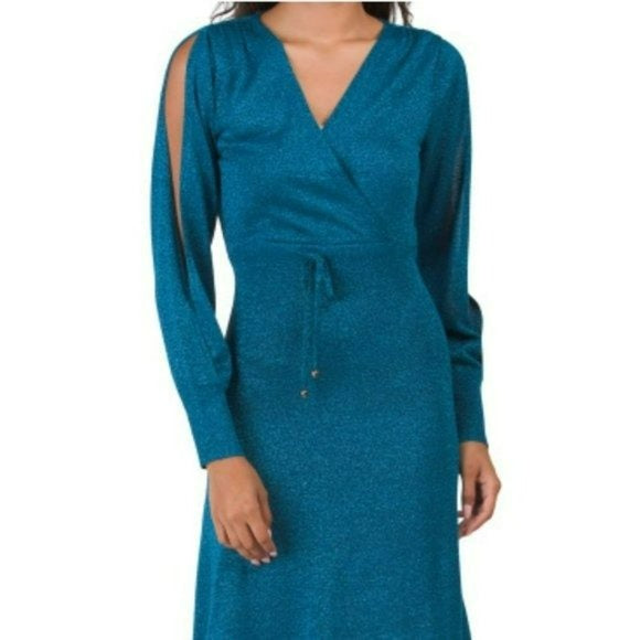 Vertigo Paris Surplice V-Neck Split Sleeve Hi-low Hem Metallic Shimmer Party Midi Dress