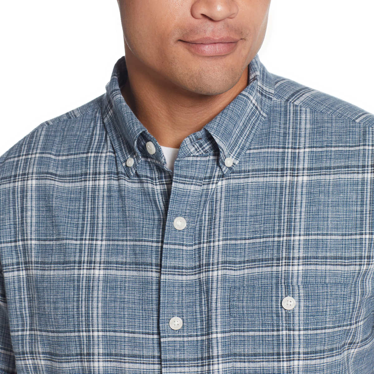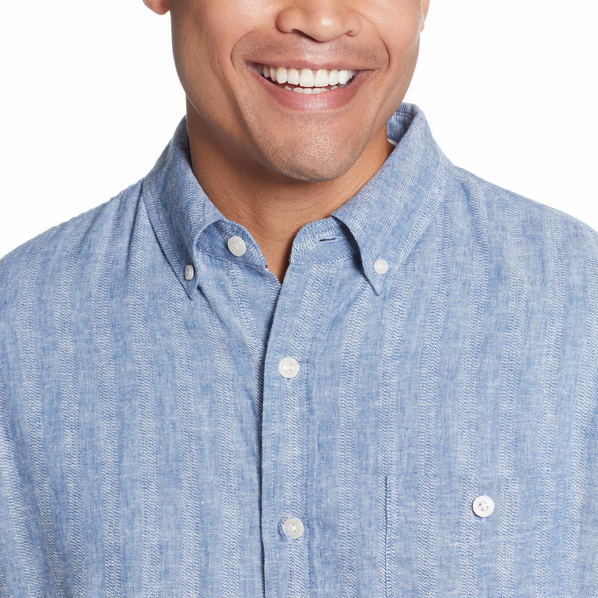 This lightweight woven shirt from Weatherproof Vintage is made of a linen blend for maximum breathability and comfort. This classic men's fit shirt also features short sleeves and a casual print for a contemporary look. Perfect for any warm weather activity.